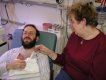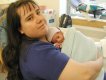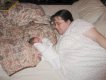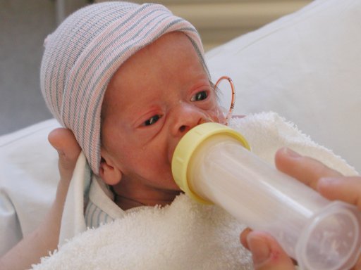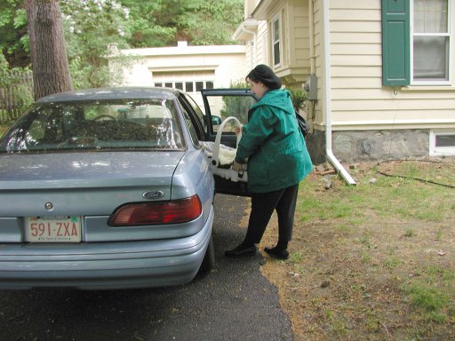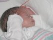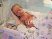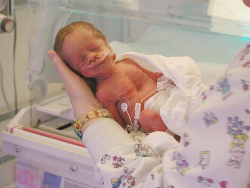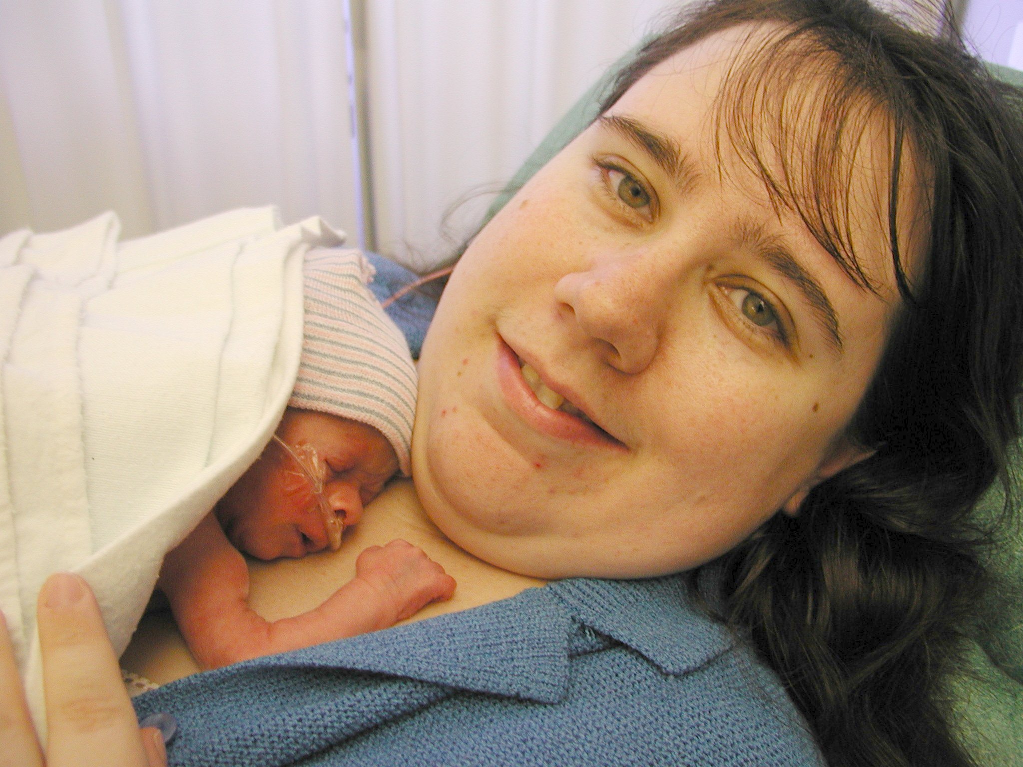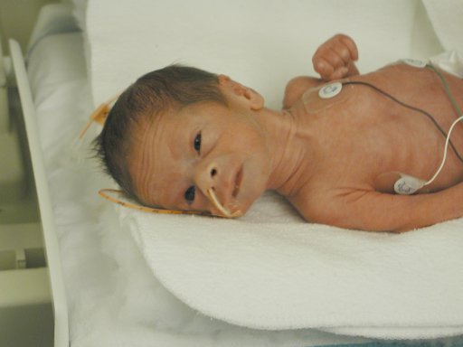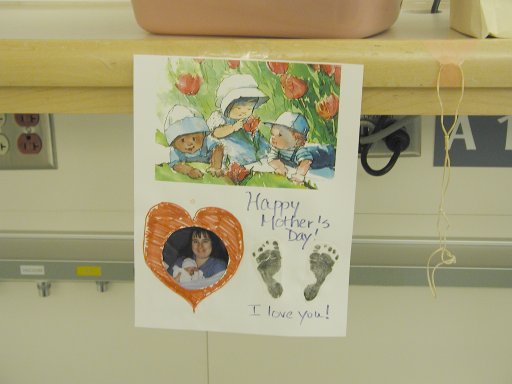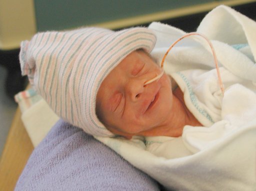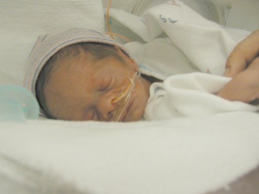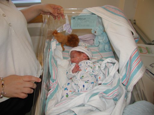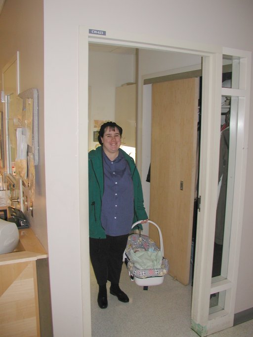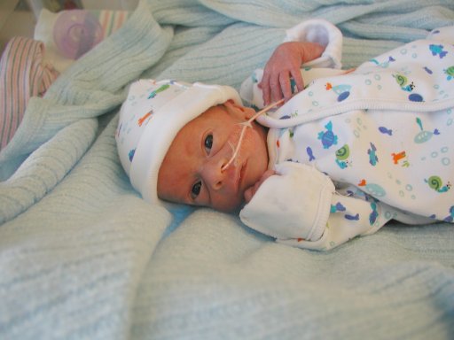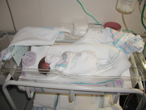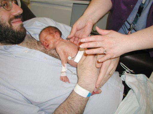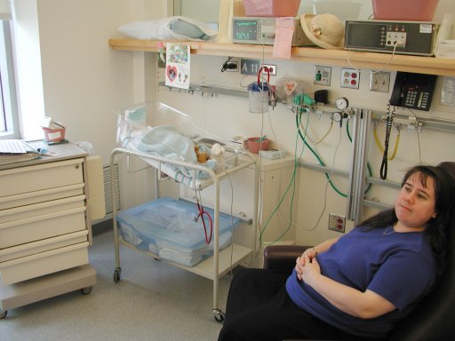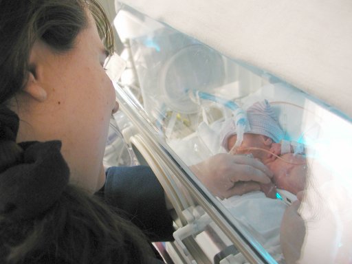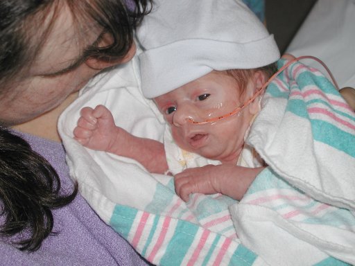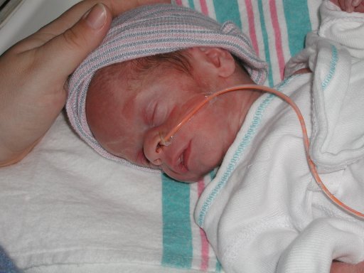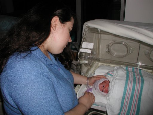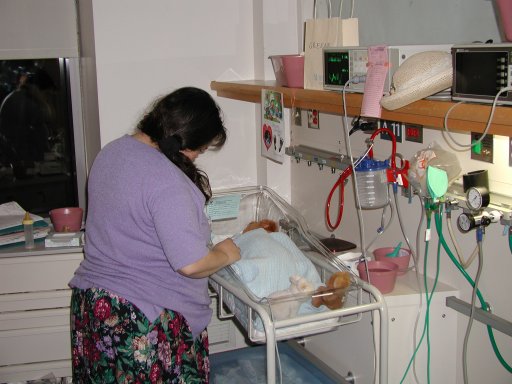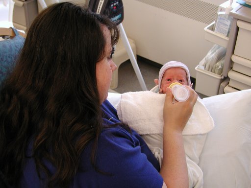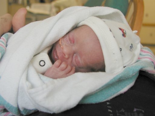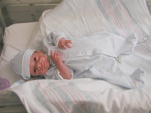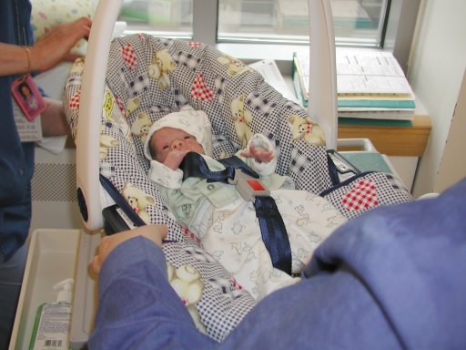 Getting strapped into the car bed in the NICU. (No, we never did see the governor or her kids.) (20010516)