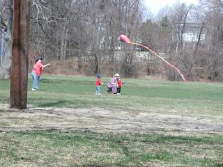 Flying kites (Tani and Momma) at Newton Centre Playground, Patriots Day Apr 19 (20040419)