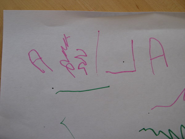 "Abba! I wroted my name!" (Yes, her esses need work and it's mirror-written.) (20070203)