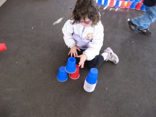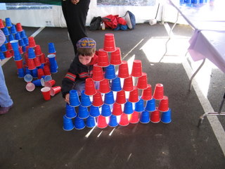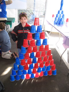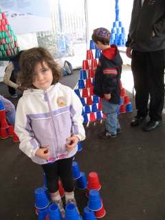 Alissa making a pyramid of cups at theWGBH Open House (20071014)